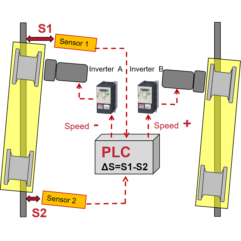 The system is composed of a PLC (Programmable Logic Controller), sensors, and an inverter. Sensors at both ends of the end carriage?continuously monitor distances S1 and S2 in real-time and transmit these values to the PLC. The PLC calculates the difference ΔS = S1 – S2.